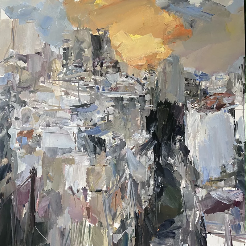 Hala Ezzeiddine's work is a riot of vibrant mark-making, whether using oil paint or charcoal. She captures chaotic cityscapes with cascading rectilinear forms, utilising charcoal and erasers to produce intricate layers. In her oil paintings, Hala achieves a continuous, dynamic barrage of colour, embodying the movement and energy of urban architecture. Her mastery of these mediums creates scenes where architecture seems to melt seamlessly into the surroundings.